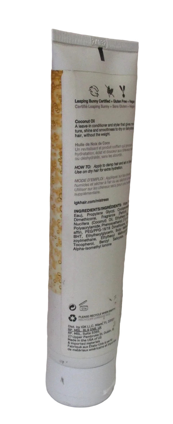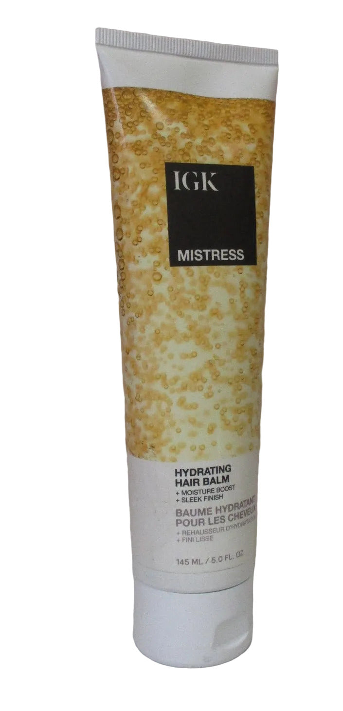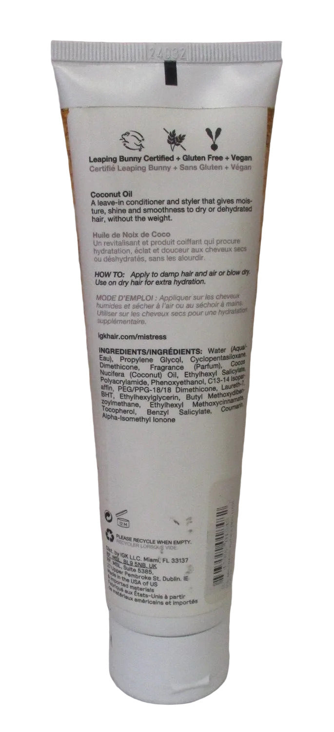 IGK Mistress Hydrating Hair Balm. This lightweight leave-in conditioning balm is infused with nourishing coconut oil to deeply hydrate, smooth, and add natural shine without weighing hair down. Ideal for all hair types, it instantly softens, detangles, and helps control flyaways while enhancing manageability. Use on damp or dry hair for a polished, frizz-free finish that lasts.