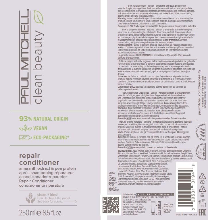 aul Mitchell Clean Beauty Repair Conditioner. This nourishing, plant-powered conditioner helps repair and strengthen damaged hair while improving softness and manageability. Formulated with organic amaranth extract and pea protein, it helps rebuild weakened strands, reduce breakage, and protect hair from future damage. Perfect for chemically treated, color-treated, or over-processed hair, this clean, vegan formula leaves hair healthier, smoother, and more vibrant with every use.